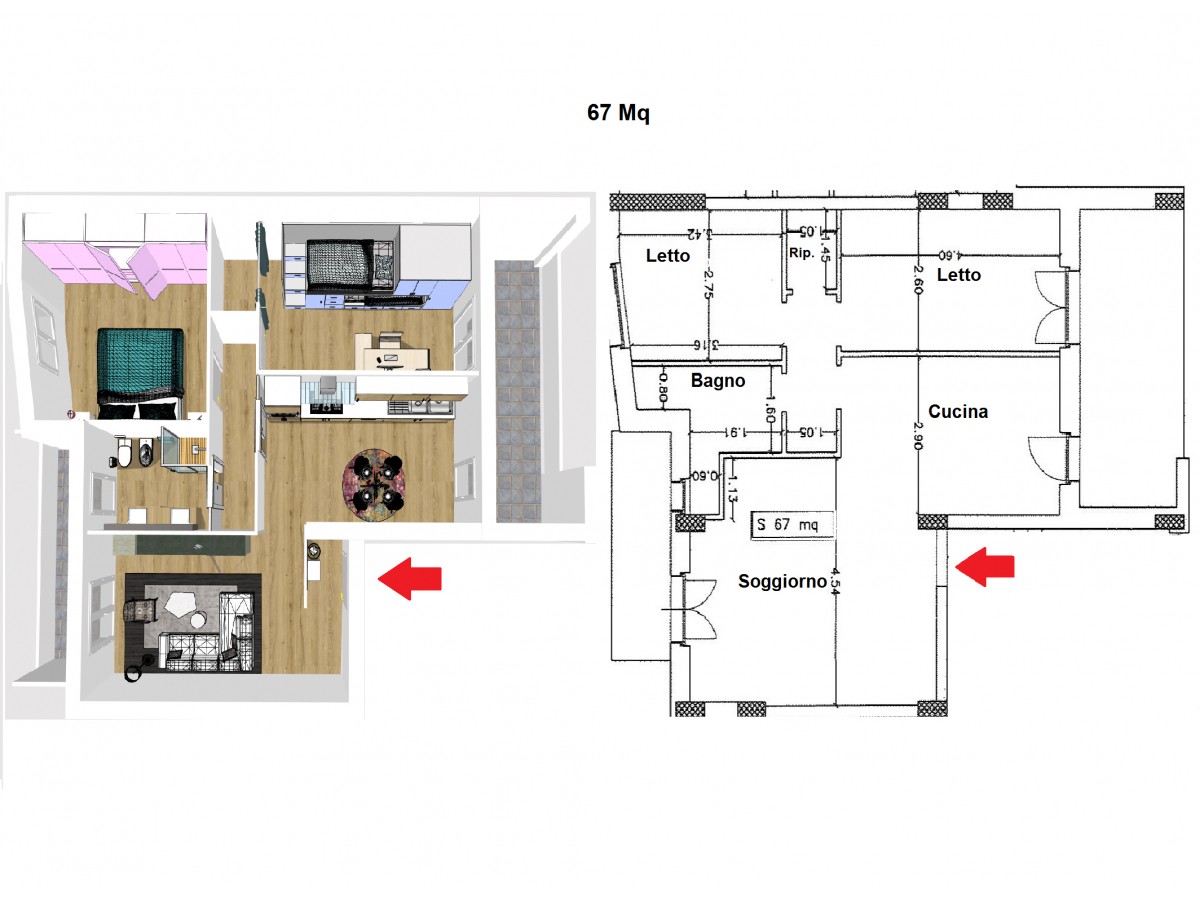 L'abitazione misura circa 67 mq ed è composta da ingresso soggiorno, cucina abitabile, camera da letto matrimoniale con cabina armadio, cameretta e bagno padronale.