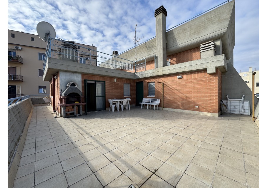 Tramite rampa interna si ha accesso al secondo livello mansardato con altezza 2,20 m suddivisa in living con cucina, camera e bagno. Dalla mansarda ci accede al vasto ed esclusivo terrazzo di 65 mq.