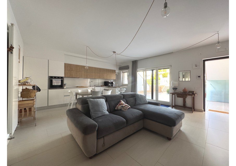L’ingresso alla proprietà avviene per mezzo di un cancello indipendente che conduce su un'ampia zona esterna pavimentata, da cui si raggiunge la porta d'ingresso dell'abitazione; entrando troviamo una zona giorno ampia e accogliente, con soggiorno e cucina open space che sfruttano lo spazio esterno descritto in precedenza.